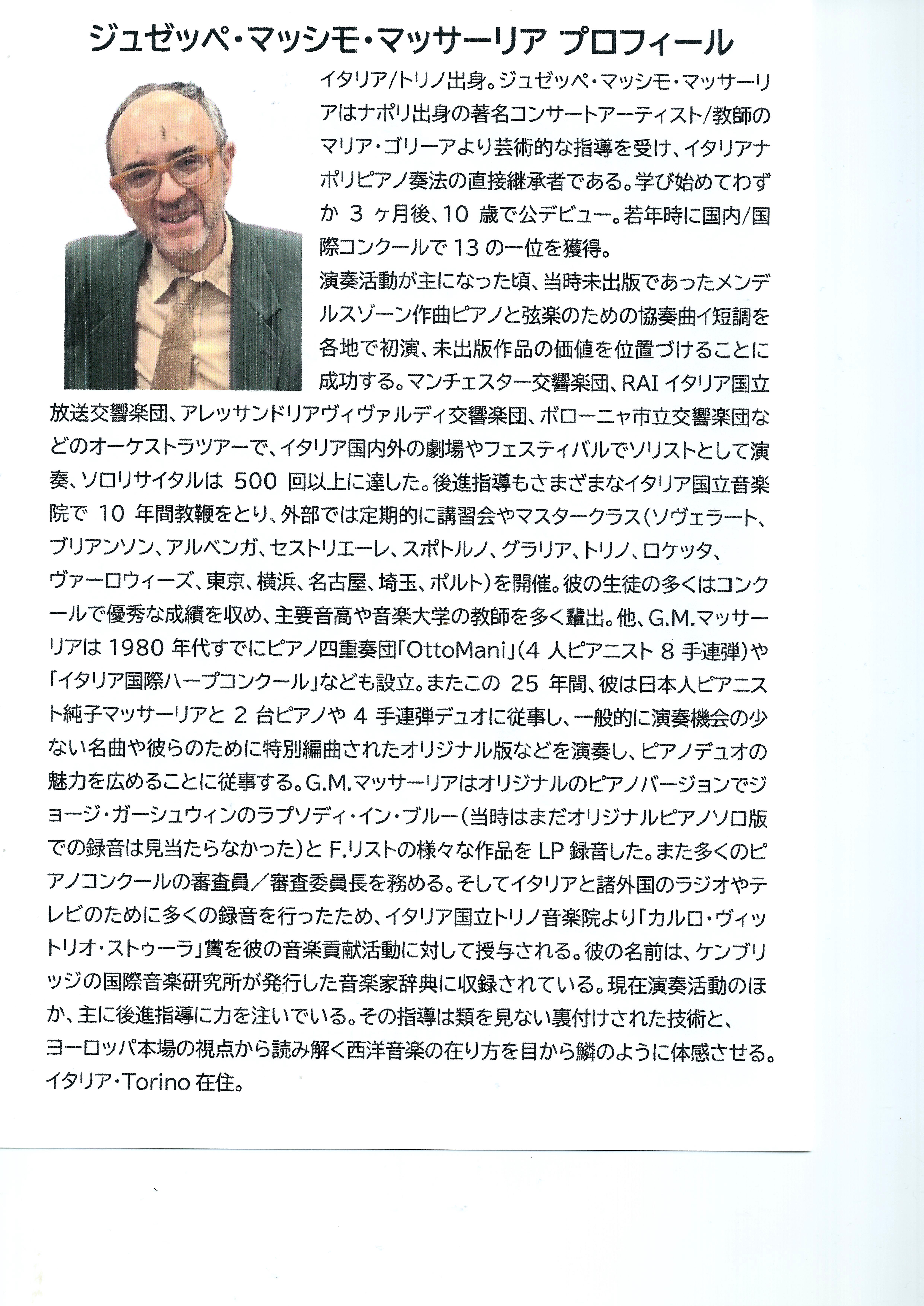Giuseppe Massaglia, demoniaco interprete d’una Tarantella del silenzio cantatore, degli amanti infelici e dei poeti, dei guappi e dei fuochi d’artificio. Maestro nel pianissimo, elettrico nel trillo, nel tremolo e nel vibrato, di G.M. devi ammirare l’esperta bravura e l’ineguagliabile eleganza, il tratto fine ma deciso con cui suscita musica, l’affondo controllato che trae trascendente dinamica dal pianoforte. Nella sua interpretazione i rivoli, le cascatelle, e gli zampilli del virtuosismo, si sono fusi in un bellissimo canto fluido e ininterrotto, con note lunghe permanenti nell’ambiente circostante, con fili di voce modulati e tesi all’infinito.