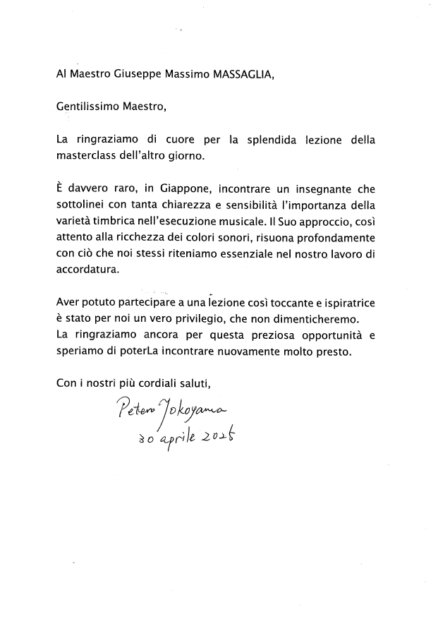 …precisa l’esecuzione della Vallee d’Obermann che ci ha rivelato un pianista quanto mai attento al colore dolce e malinconico della pagina…molto gradito il notturno “ sogno d’amore “ in cui Massaglia ha messo in luce con un tocco morbido e dolce il contenuto espressivo del brano forse piu’ popolare di Liszt.