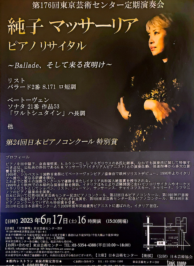 È nata a Kanagawa (Giappone). Ha iniziato in giovane età lo studio del pianoforte e parallelamente dell’arpa e della danza classica. Nel 1991 ha vinto l’importante concorso pianistico nazionale “Japan”. Si è poi laureata con il massimo dei voti ed è entrata nel corso superiore di perfezionamento del M° Sakiko Nagayo. Ha lavorato presso lo studio d’opera Nikikai a Tokyo (il più importante del Giappone) come docente e Maestro sostituto. Nel 1995 ha vinto l’audizione per giovani musicisti a Tokyo ed ha debuttato in Romania con la Turgu-Mures State Philarmonic Orchestra come solista. Nel 1996 è arrivata in Italia ed è stata ammessa all’Accademia pianistica di Imola con il M° L. Margarius, per poi perfezionarsi ulteriormente con il Mº A.Lucchesini. Ha vinto numerosi primi premi in concorsi nazionali e internazionali, tra cui il concorso Internazionale “Gino Gandolfi” di Salsomaggiore, il “Città di Valentino” di Castellaneta (TA), in occasione del quale è stata insignita della targa del Presidente della Repubblica Italiana, il “Riviera Etrusca” a Piombino, il “Vigliano Viva” a Biella, il “Giulio Viozzi” a Trieste, il Premio “F. Chopin” di Racconigi (CN), il “Perosi” di Tortona , l’ “Internazionale” di Cogoleto ed tanti altri. Ha effettuato una serie di concerti in Giappone con repertorio lideristico in duo con soprano e nel 2002 è stata ammessa alle due Masterclass tenutesi a Stoccarda e ad Acquasparta con il grande Maestro Dietrich Fischer-Dieskau sull’opera di Hugo Wolf. Si è esibita come solista con l’orchestra da camera Petrassi di Roma , l’orchestra State Philarmonic di Turg-Mures, la Filarmonica “Mihail Jora” di Bacau , la Filarmonica “Dinu Lipatti” di Satu Mare, l’orchestra da camera di Chiba e l’orchestra Sinfonica di Yokohama (Giappone) eseguendo il concerto n.3 di Beethoven, il concerto n.2 di Chopin e di Schumann, il concerto n.1 di Liszt , di Saint-Saens e di Turina, il concerto n.2 di Rachmaninoff e il concerto n.1 di Tchiaikowski . Nel marzo 2009 ha vinto il Concorso pianistico Tokyo Art Center Memorial, ottenendo la Gold Medal e il Premio Speciale per i punteggi più alti ottenuti dalla Giuria e dal pubblico. Nel marzo 2010 è stata insignita del titolo “pianista migliore dell’anno – 2009 Japan Art Center”. Nel 2020 ha vinto il Concorso pianistico Japan Art Center Memorial e nel 2021 il Concorso pianistico Kobe Art Center Memorial, entrambi con la Gold Medal.